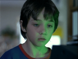 The final sequences of the episode truly broach the ethical question of placing science ahead of faith. First, sitting in his apartment, Krzysztof notices the computer turn on, and again it shows the words “I am ready.” After this event, he goes to the church where several candles are lit on a table. Krzysztof shoves the table over, causing wax to drip on a picture of the Virgin Mary in the form of a tear. The symbolism here is clear, as the religious icon weeps for the lost child on behalf of the audience. Krzysztof then brings a block of frozen holy water to his forehead as Kieślowski takes us back to a scene from early in the episode where an image of Paweł and some other children can be seen on a television. The episode closes on a close up of Paweł’s face on the screen.