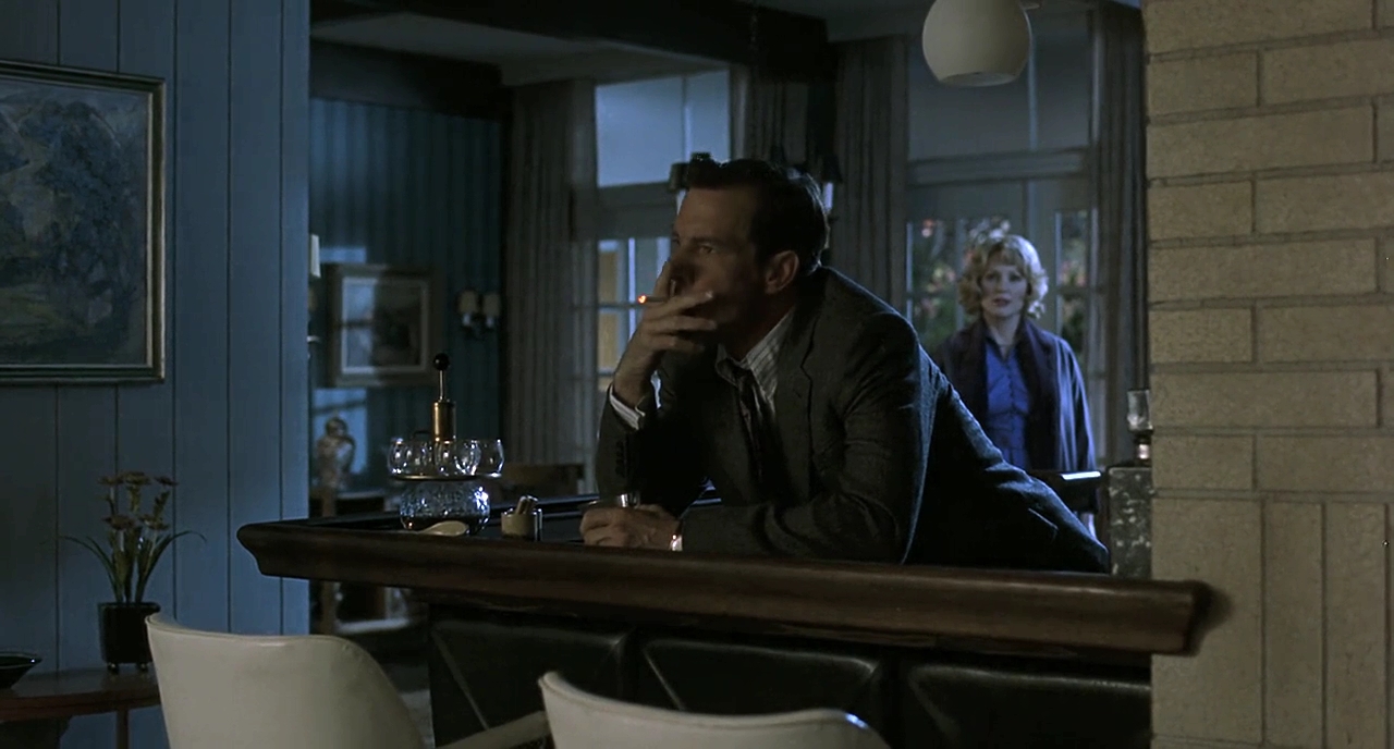 Far from Heaven’s exploration of homophobia and racism in the 1950s is simple to observe. In terms of homophobia, Frank, as with the prisoners in Homo, self-represses. He goes to a gay conversion doctor while Kathy refuses to mention his issues with homosexuality to any of her friends. The mere suggestion of him being gay would ruin his reputation, as demonstrated by Kathy’s friend Eleanor (Patricia Clarkson) and her homophobia in describing a man she thought was gay by calling him, “a bit flowery” and “light on his feet”. It is these euphemistic terms that define homophobia, as people of the time – as Eleanor says – “prefer men to be men”. Though Sirk touched on racism in Imitation of Life, none of his films touched on gay men in America, hence Haynes’ revisionism. Here, he takes what was left for subtext or forgotten entirely and brings it to the forefront. Though he keeps the taboo of adultery from All that Heaven Allows, this addition of a gay lover for Frank adds further depth to the “repressed housewife in suburban America finds love in a melodrama” story forged by Sirk so many years prior as it shows the issues faced by men who also had to pretend in this era. Not only are the housewives repressed, but so are the men as they are often unable to explore their own desires and sexuality for fear of public rejection. As a successful advertiser, Frank stands to lose everything if he embraces his homosexuality. Thus, he is forced to pretend and play straight to keep his position in the community and the world, forcing him to indulge in his repressed desire in the dark and in secret as in Homo. He is a man forced to live in the shadows, hiding out in his dark office at night – an office that is often engulfed in either blue or green whenever Kathy visits – to finally give into the passion he feels.