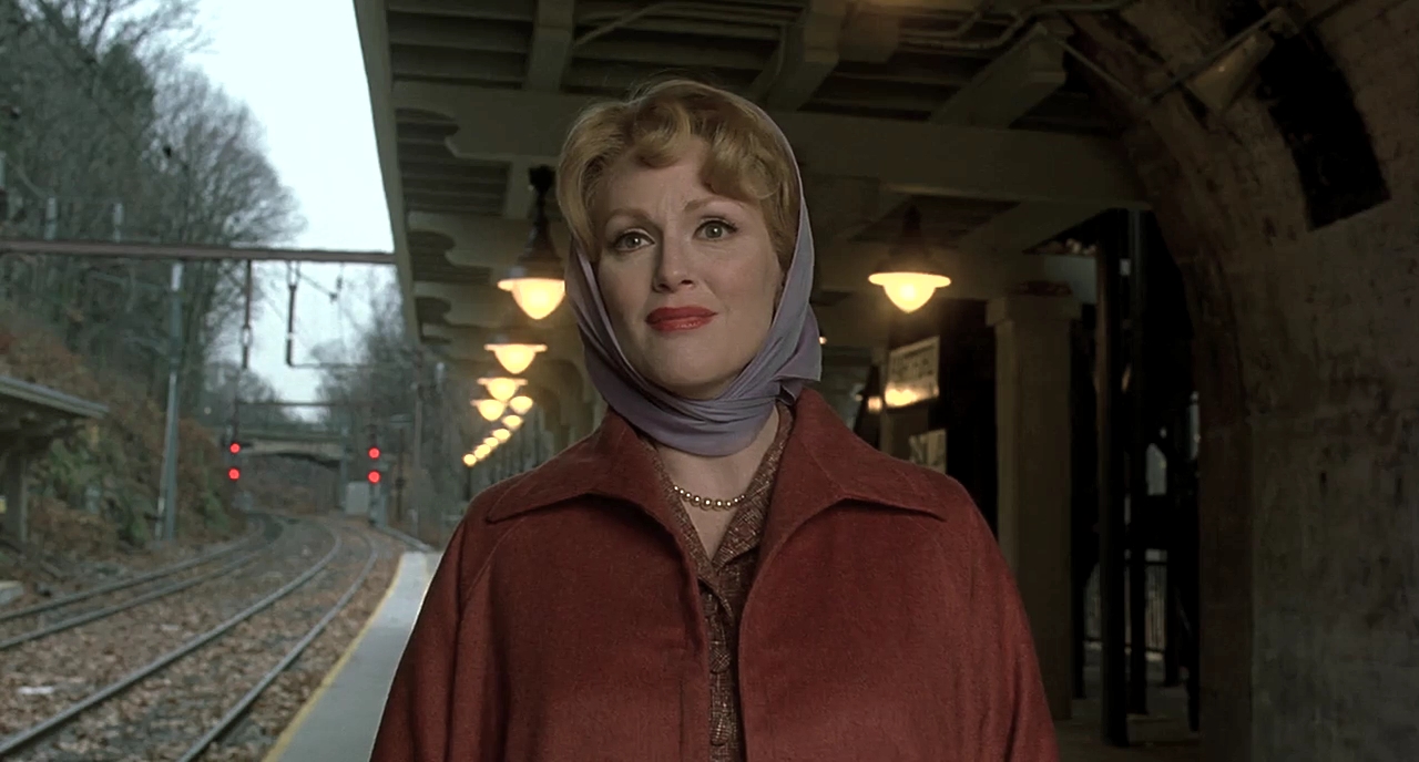 Set in 1957-1958 Hartford, Haynes’ fourth feature-length film Far from Heaven is styled similarly to the work of Douglas Sirk, in particular All that Heaven Allows (1955) with racial themes in line with Imitation of Life (1959). The film centers on the life of Kathy Whittaker (Julianne Moore). With her husband Frank (Dennis Quaid) slowly discovering he is gay and with Kathy developing feelings for their Black gardener Raymond (Dennis Haysbert), Haynes is able to work with themes in a way that Sirk could never have imagined in the 1950s. Using the same basis as Sirk with Kathy as an upper class but repressed housewife falling for a man of a lower class – akin to a socialite housewife played Jane Wyman falling for a lower class gardener portrayed by Rock Hudson – Haynes manages to explore the sexual repression of women in the 1950s and classism as Sirk did in All that Heaven Allows, with his revisionism coming in via the focus upon homosexuality and racism. In mirroring Sirk’s work, however, Haynes relies upon an old-school opening credits sequence with an orchestra-based score playing in the background, dresses Julianne Moore similarly to Jane Wyman, and uses a similarly vibrant and welcoming color palette as Sirk. However, Far from Heaven departs from Sirk by relying on cold blues and greens as opposed to the warm reds, oranges, and browns of All that Heaven Allows that created a homely feeling. Though the colors pop on the screen similarly to the glorious Technicolor of Sirk’s films, allowing Far from Heaven to be nearly as visually lush as its inspiration, the impact is vastly different. By capturing 1950s America in a similar way to Sirk – both visually and thematically through the class system of Kathy’s neighborhood – Haynes elicits nostalgia, but the color scheme hints at something entirely different from All that Heaven Allows. Rather than being a film defined by its warmth, Far from Heaven is a film that relies on cool colors to capture the isolation and alienation of Kathy and Frank for their indulgence in social taboos.
