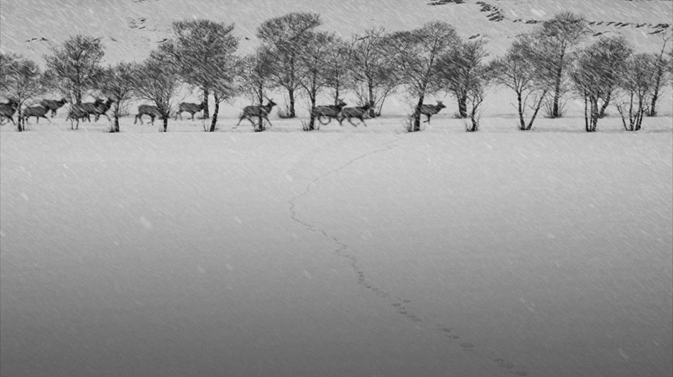 At the base of a large hill, there is a clearing. Snow falls covering both hill and clearing in white. At the base of the hill are two rows of trees, forming a path. A flock of birds sits on the side of the hill. A shot rings out. The flock flees. Moments later, deer run through the path from left to right, into and out of the frame. One deer stops and looks back. It calls out. More deer run by it, three or four at a time. The deer slowly inches to the left, back toward danger. Individual birds fly by. More deer flee, three or four at a time. The rebel inches closer to the left side of the frame, closer and closer to danger. Another shot rings out. The deer doesn’t flinch. More deer sprint past, three or four at a time. The deer calls out again. A single deer emerges from the left side of the frame, meeting his companion at the nearest point to danger. The pair walk the path slowly, side-by-side, inching ever closer to the right side of the frame. Ever closer to safety and sanctuary which is perceived to be just off screen. Closer they inch, slowly, as we wonder whether danger will rear its head again. The companions disappear off the edge of the screen, and though they have merely dropped out of this small frame, we know somehow that they are safe.