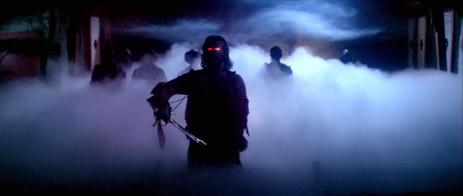 These sound effects are made all the more impactful by the film’s strong special effects and overall visuals. For the former, the sound of three knocks on a door from a hooked hand as fog billows around outside is a truly creepy noise, but the added imagery of some silhouetted figure ominously standing there with blood red eyes elevates it to another level of terror. Carpenter’s use of the fog effects throughout often exemplifies what makes the best horror films so effective, with the fog serving as a visual representation of the feeling that every character is surrounded by danger. In this case, it is very literal as the fog brings with it the ghostly souls of the sailors lost at sea 100 years ago. Thus, as the fog rolls onto shore or as homes are engulfed by the fog, Carpenter creates a situation where you just want to jump up and scream at the television in panic. You desperately want to warn the characters that there is something creeping up behind them or that they should not open the door, panickedly fidgeting in your seat, biting whatever fingernails you have left by that point. All the while, Carpenter plays with the mise-en-scène, trapping the characters- both literally and figuratively with the film heavily employing classic shadowy noir bars to symbolically trap characters in a home- all with his nervy score crescendos and glass shatters all around.