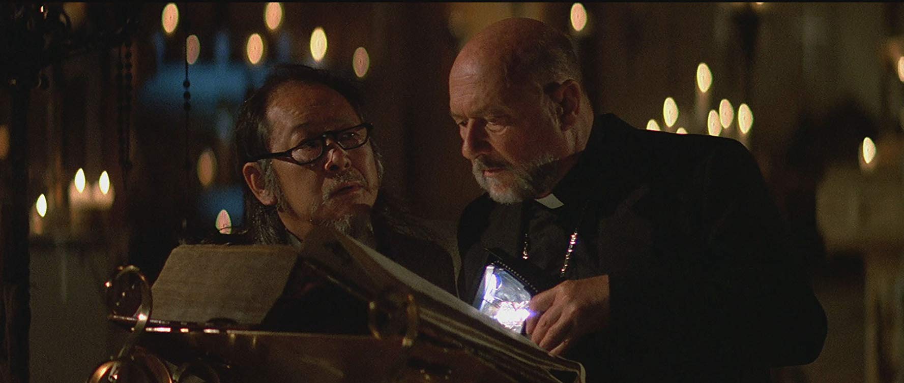 The second entry in John Carpenter‘s “Apocalypse Trilogy”- after The Thing and before In the Mouth of Madness – Prince of Darkness is a chilling film set in Los Angeles. Following the death of a priest, a nun alerts her superior, the Priest (Donald Pleasance), that the dead man was set to meet with His Eminence about something. All this dead man had in his possession was a notebook informing the living Priest about two key clues: the existence of a hidden order known as the Brotherhood of Sleep and the purpose of this sect to guard something located in an abandoned church basement. Upon discovering what it is that is hidden in the 1500s catacomb basement built under this church, the priest knows he needs help. Thus, he alerts his friend and non-believer Professor Birack (Victor Wong) about what is in the building and what the dead priest told him. Birack then recruits a group of his graduate students and a few other science departments to help the priest determine how to stop what will happen, whatever that may be.