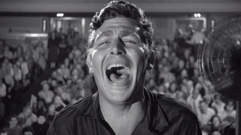 The last film we’d like to talk about this month is a Criterion release that both you and I watched fairly recently as part of our internal film club we run here at Cineccentric. The film is Elia Kazan‘s 1957 A Face in the Crowd, an electric satire about a drunken drifter (played by Andy Griffith) who gets picked up and given a platform by a local radio station because of his charisma. The drifter, Larry “Lonesome” Rhodes, is a rather nasty character, but nevertheless gains incredulous popularity for his bluntness. The film watches as he skyrockets to stardom, inserting himself into everything from male vitality pill advertisements to politics.