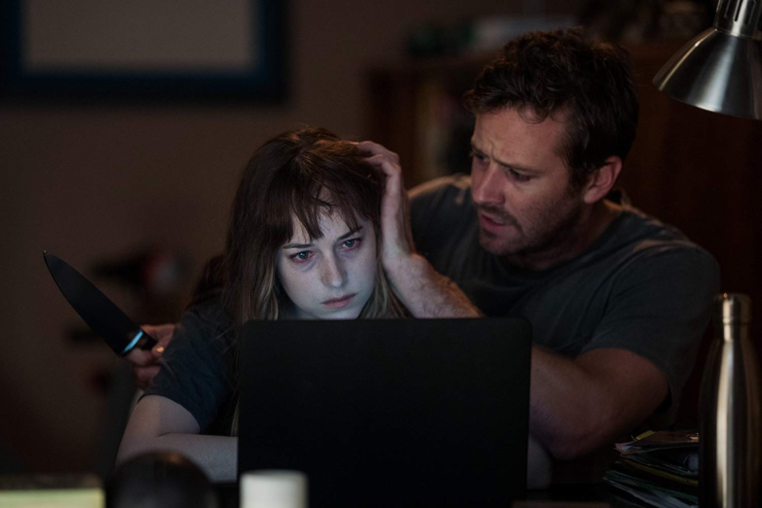 In any case, both play their roles with the utmost sincerity, lacking a single shred of irony even while delivering some of the most absurd dialogue I’ve heard in years. Hammer is especially marvelous in his caricature of a character, a completely one-dimensional frat-bro of a bartender whose only driving motivations are blackout intoxication and sexual conquest. He plays Will with almost the same level of uncomfortable intensity he exuded in Sorry to Bother You, more uncanny here despite a slight reduction in psychotic volume. On the contrast, Dakota Johnson is severely underutilized, appearing in but a handful of scenes that were ostensibly only conceived to accuse her partner of infidelity and stare at an unexplained video of a creepy tunnel. Her performance is somewhat of a return to her Fifty Shades days (dashed with a hint of The Room‘s Lisa) but she still gets a surprising amount of unforeseen comic mileage for the screen time she does receive.