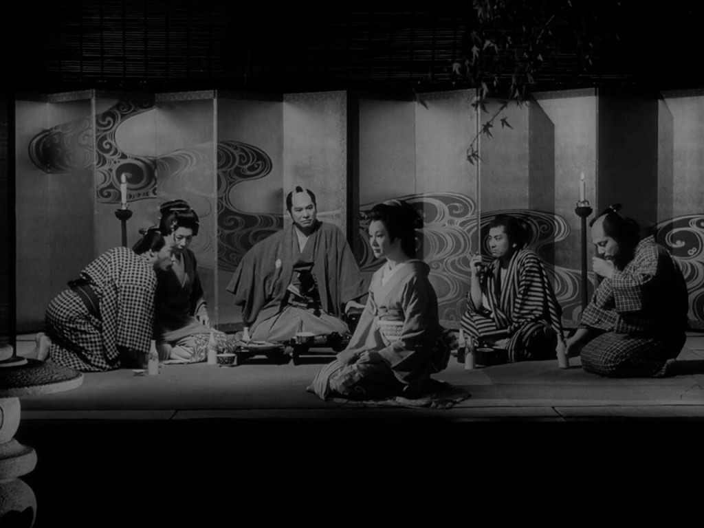 As a pawn within an elaborate scheme, penniless samurai Gengobe (Katsuo Nakamura) is duped by his lover Komon (Yasuko Sanjo), a geisha, who with her secret husband exploits Gengobe’s trust by duplicitously stealing money belonging to his samurai clan. Gengobe comes to realise this betrayal as he spies on Komon and the cacophony of tormentors – including her husband – who mock him and his poverty. Through direction that can only be described as Shakespearean, everything within the composition of this scene emphasises its performative nature: Komon is centre-stage with her profile to the camera, rendering her words indirect and duplicitous. ‘A geisha lives a life of lies’, she says, as the camera occupies an unnatural distance from the room, emphasising the stage-like optics of this spectacle.