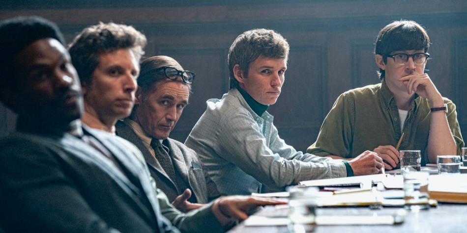 Passionate and often powerful, Aaron Sorkin‘s The Trial of the Chicago 7 arrives at an apt moment. Modern parallels are clear with racial and political protests that dominated headlines in the summer of this year and have continued in the months since. The Trial of the Chicago 7 showcases leaders of individual factions of the progressive movement in the 1960s on trial for riots that occurred at the 1968 Democratic National Convention. Dissatisfied with Hubert Humphrey being chosen as the candidate, the film opens as the leaders of these student groups rally their followers to protest in Chicago. Trying the legal route with permit applications, they are rebuffed by the government and opt to nonetheless protest. Upon Richard Nixon’s election, new Attorney General John Mitchell (John Doman), upset that his predecessor Ramsey Clark (Michael Keaton) resigned later than usual, decides to reopen a case that Clark had passed on. Prosecutor Richard Schultz (Joseph Gordon-Levitt) is tasked with prosecuting Tom Hayden (Eddie Redmayne), Abbie Hoffman (Sacha Baron Cohen), Jerry Rubin (Jeremy Strong), Rennie Davis (Alex Sharp), David Dellinger (John Carroll Lynch), John Froines (Daniel Flaherty), Lee Weiner (Noah Robbins), and Bobby Seale (Yahya Abdul-Mateen II) for inciting a riot.