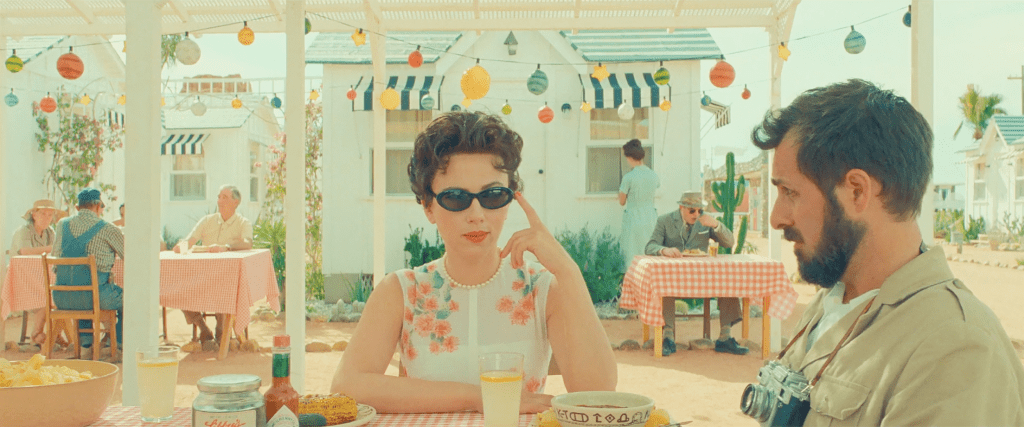 “Asteroid City” is appropriately set on the precipice of oblivion. Atomic tests occasionally cause tremors in this mid-1950s California-Nevada-Arizona border town. The town itself is named after an asteroid that struck 5,000 years ago and left a crater, one where aliens will soon arrive and leave the visitors awe-struck and the government scrambling for ways to contain the story. The town has a ramp for a highway that goes nowhere and ran out of funding after being built. It is both literally and metaphorically at the edge of the universe, whether harboring death around the corner, containing a portal to extraterrestrial life, or representing the near-constant unknowability of what the future holds while forever existing under the reality that death could strike at any moment. “Clear vision ahead with rear vision mirror,” reads a sign at the one-bay car garage in town, an apt complement of many of the film’s themes and situations in which Augie reckons with the death of his wife, the town struggles to cope with surreal events and their various issues: play producer Schubert Green (Adrien Brody) with his divorce, and actress Midge Campbell (Scarlett Johansson) with her traumatic past (with clear parallels to Marilyn Monroe). For all of them, their past is clear. The events are known. It is the present and future that are unpredictable.