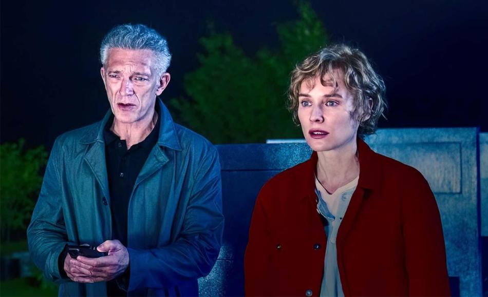 When select tombs are vandalized including Karsh’s wife’s, Karsh struggles to determine a suspect and a motive. GraveTech is controversial, and between the CCP, religious groups, protesters, and Dr. Eckler (a doctor who treated Becca in her final months who was also Becca’s ex-lover), Karsh isn’t sure who is the most likely to commit this act. Add in Becca’s sister Terry (Kruger) and her husband Maury encouraging Karsh to consider conspiracies, and Karsh is thoroughly stumped. The Shrouds emphasizes this unknown and fosters a sense of paranoia as Karsh is haunted by dreams of Becca that reference Dr. Eckler and it is revealed that Karsh is being spied on. Karsh finds himself over his head, and forces beyond his control – death, Dr. Eckler, the unknown vandals – weigh on him. While his character could be written and portrayed as relatable to audiences experiencing grief, Cronenberg and Cassel resist this in Karsh’s character. He is cold in demeanor, and his business interests (and if not that, his ambitions for profit) may be offputting. And when it is pointed out that Terry is an identical sister to Becca, you can imagine the salacious turn the film will take.